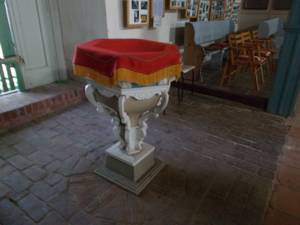 Bild: Taufschale. Der Taufständer stammt wahrscheinlich aus gleicher Zeit wie die Schaffung der Kanzel (1733), ebenso die Taufschale. Die Schale wurde 1945 bei der Plünderung beschädigt; es musste ein neues Stück eingefügt werden.